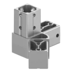 40×40 mm profillerle uyumlu, 45° geniş açılı ve sağ yönlü, kaynak gerektirmeyen üç yollu alüminyum köşe konnektörü.